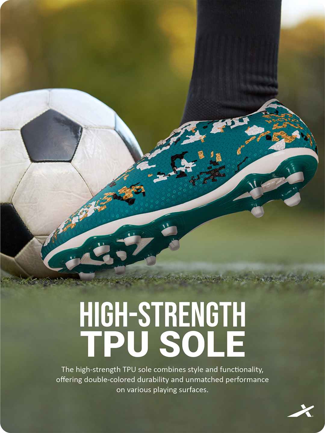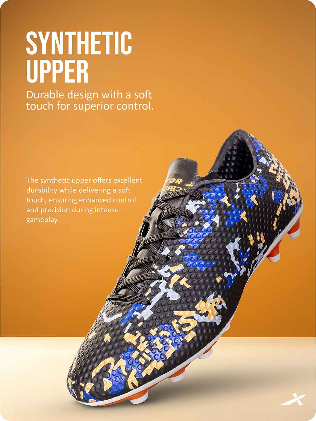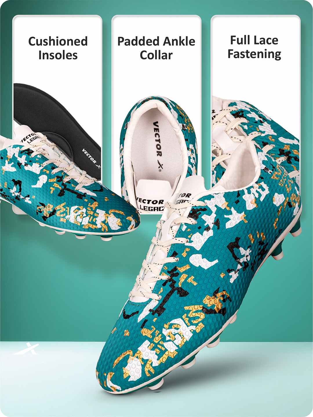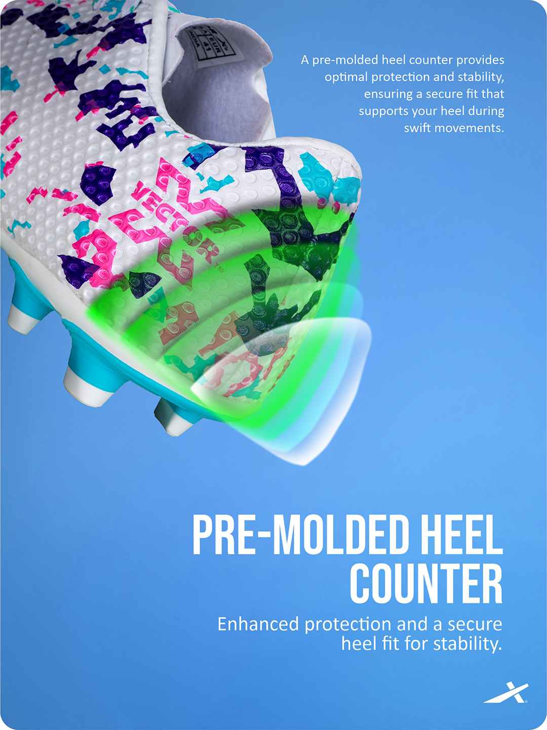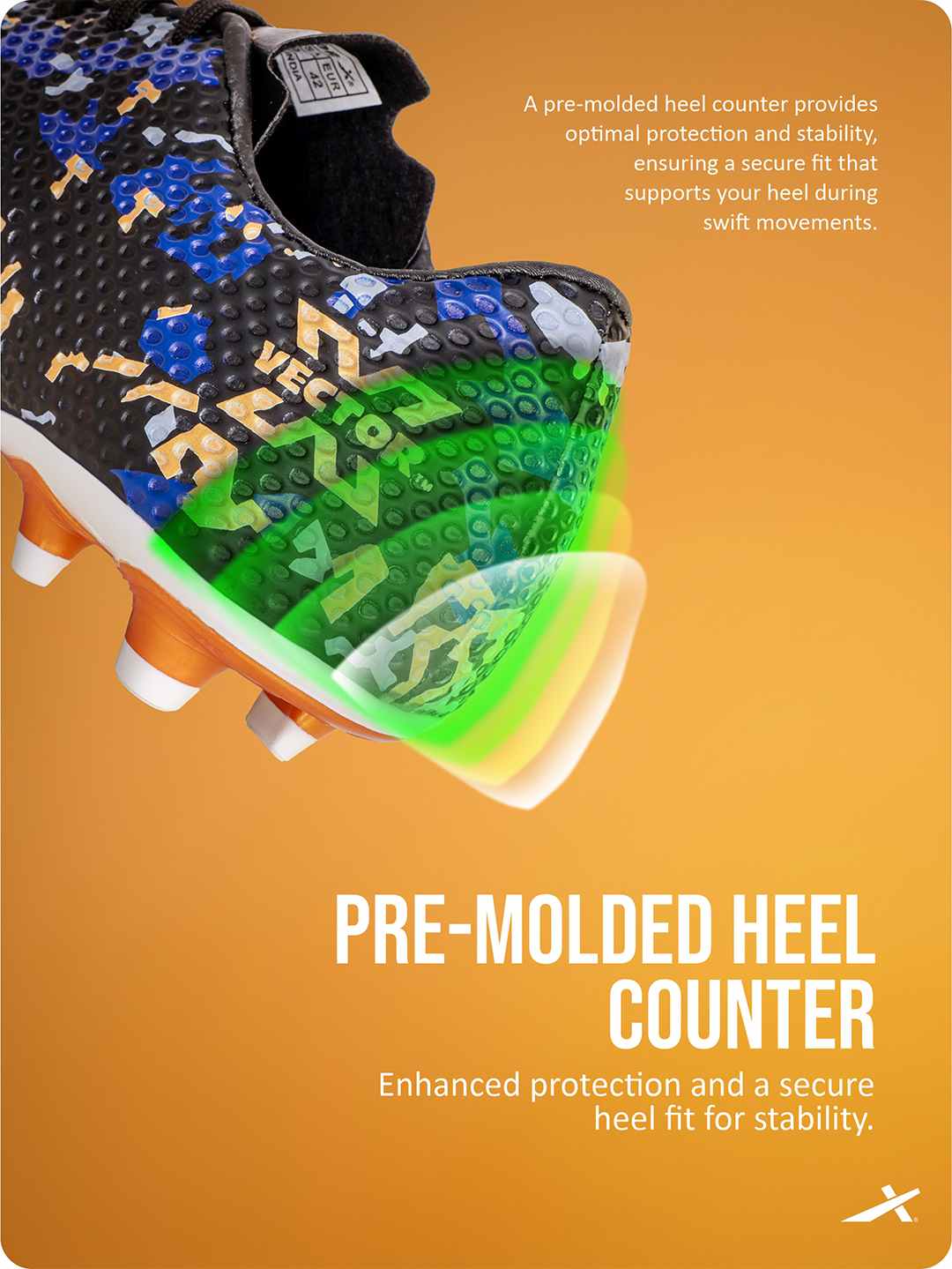 Designed for champions, the Vector X football shoes combine cutting-edge materials with comfort-focused construction. Featuring a 3D textured upper with TPU fusing, these shoes offer superior ball control and a sleek look. The electroplated TPU sole ensures high abrasion resistance and long-lasting durability, while strategically placed studs enhance traction on the field for agile movements and quick turns. With moulded breathable in-socks, they provide all-day comfort during training and matches. Built to perform — built the Vector X way.