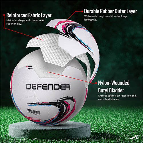 Vector X Defender Rubber Moulded Football is designed for intense training sessions and practice matches. Made with a high-quality rubber moulded outer, it ensures excellent durability and long-lasting performance on various surfaces. Its sturdy construction offers superior grip, control, and consistent flight for an enhanced playing experience. Whether you’re a beginner or an advanced player, this football is perfect for honing your skills. Ideal for schools, academies, and club training, the Defender Football is built to withstand rigorous use.