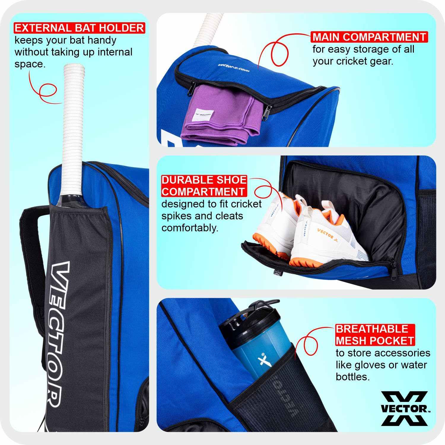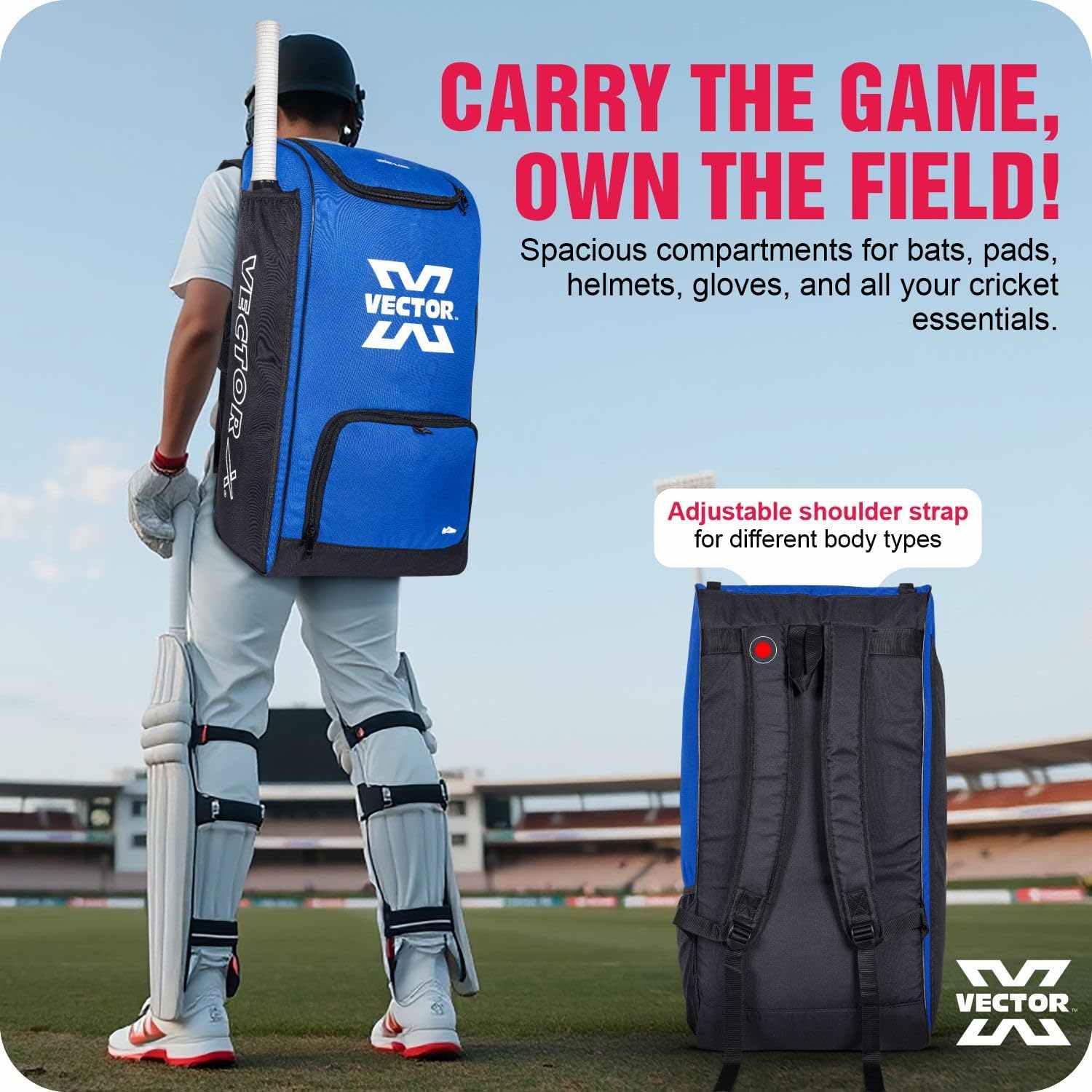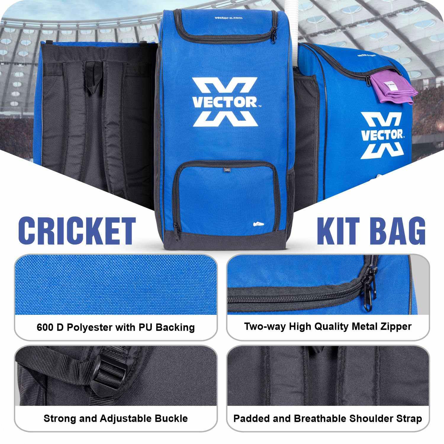 Step onto the field fully equipped with the Vector X Cricket Kit Bag, engineered for durability, comfort, and smart storage. Made from high-quality 600D polyester with PU backing, this bag delivers long-lasting strength and protection for all your gear.Access your equipment with ease using the smooth metal two-way zipper, while the strong adjustable buckle keeps your items secure on the go. The padded and breathable shoulder strap ensures maximum carrying comfort, even during long travel hours.Designed with practical features like an external bat holder for quick access and a dedicated shoe compartment spacious enough to fit cricket spikes or cleats. An added breathable mesh pocket keeps accessories like gloves or water bottles organized and ventilated.
