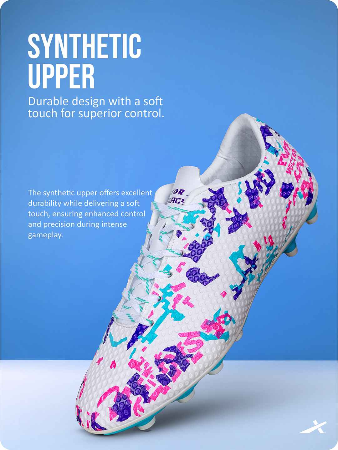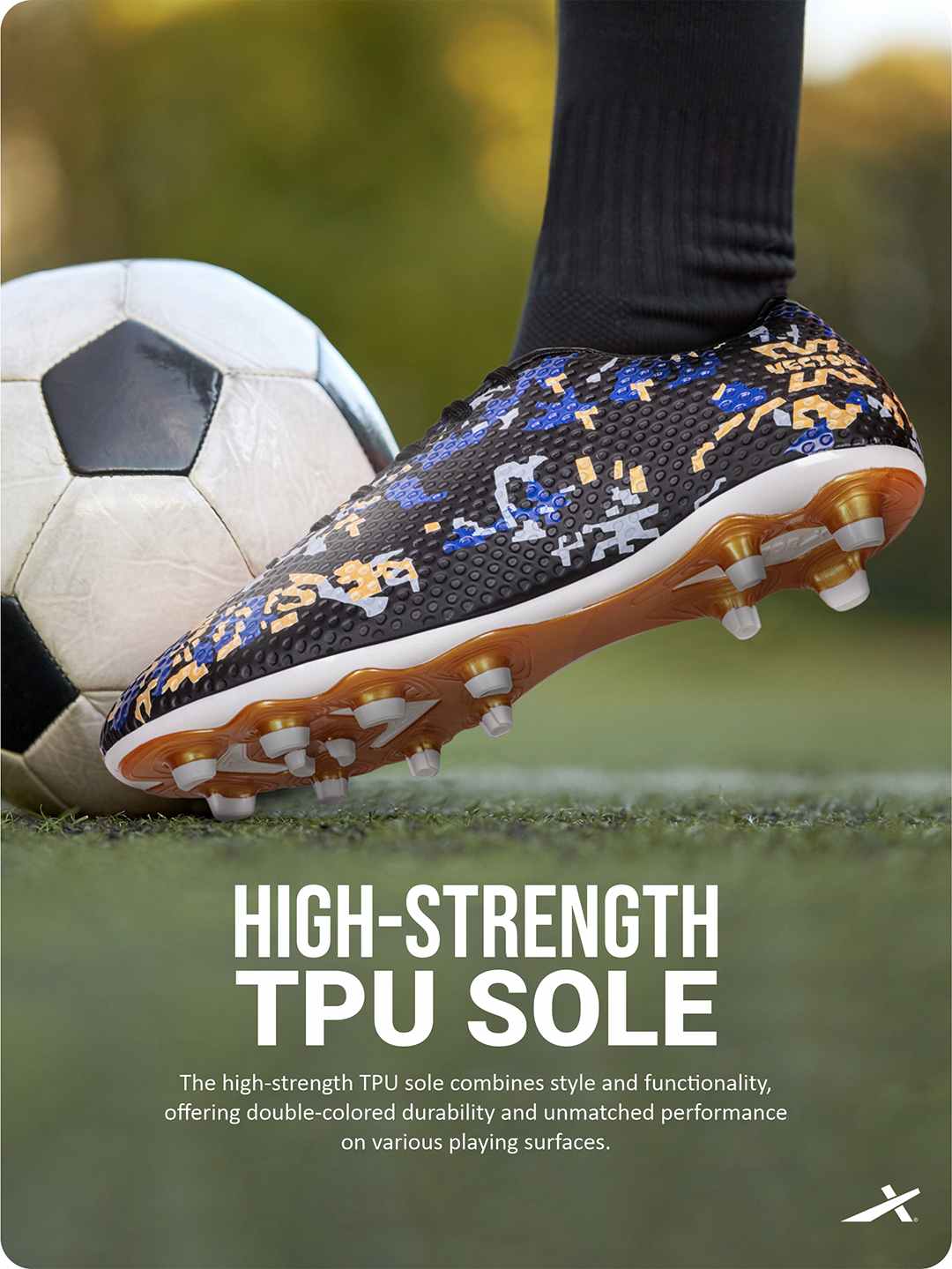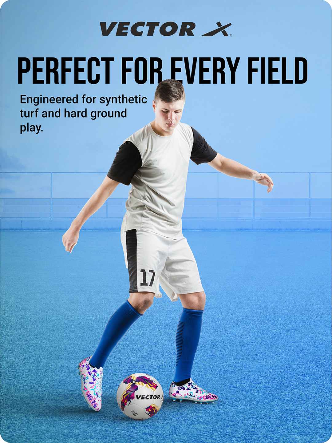 Designed for champions, the Vector X football shoes combine cutting-edge materials with comfort-focused construction. Featuring a 3D textured upper with TPU fusing, these shoes offer superior ball control and a sleek look. The electroplated TPU sole ensures high abrasion resistance and long-lasting durability, while strategically placed studs enhance traction on the field for agile movements and quick turns. With moulded breathable in-socks, they provide all-day comfort during training and matches. Built to perform — built the Vector X way.