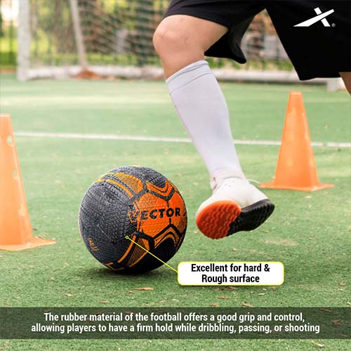 Unleash your inner Messi with this Street Soccer rubber moulded football by Vector X! Crafted from durable rubber, this football can be used to play on hard surfaces as well. The strong bladder and the secure valve ensure that there will be no leaks while you indulge in a game of football with your friends or colleagues. This football can be used for training purposes as well as it comes in the standard size 5...