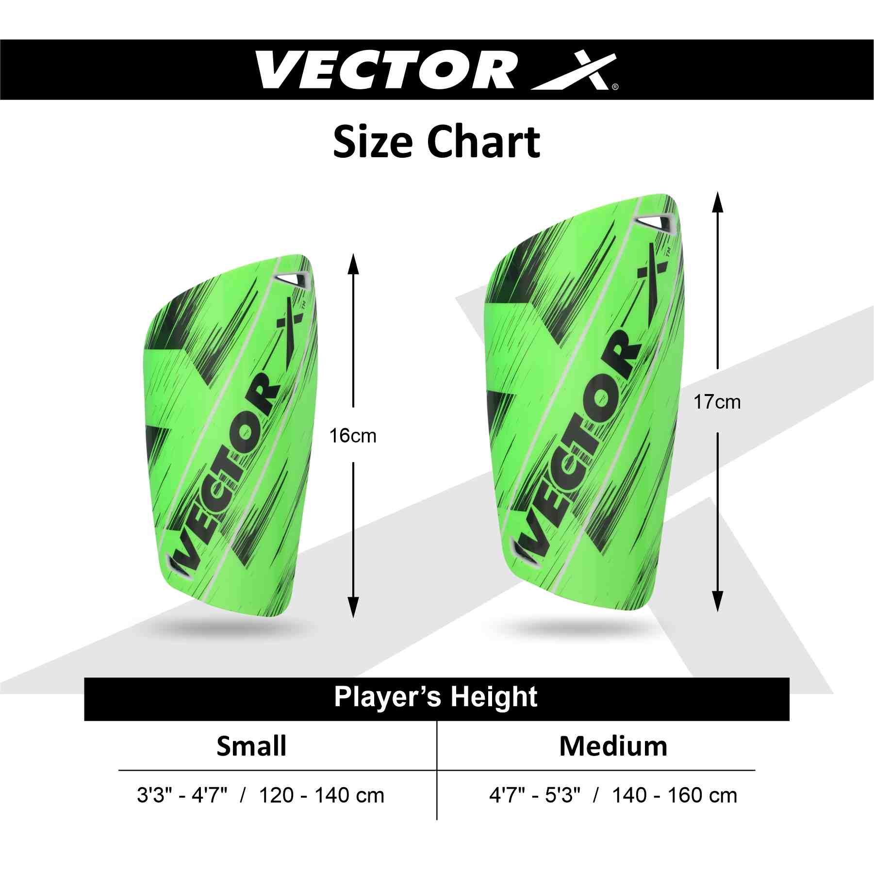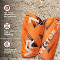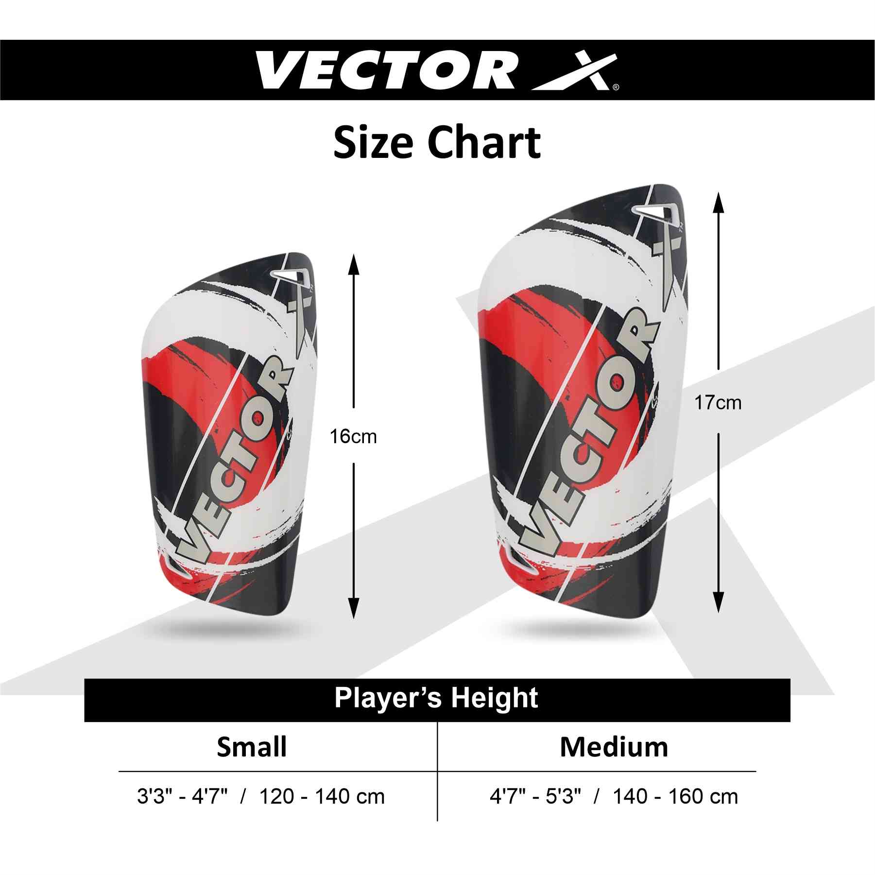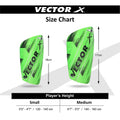 Made with high quality synthetic material so that the product ensures you best fit and top class protection and ensure player safety., Its ergonomic contour moulds gives best possible fit to almost every player., Vector X Shinguard has synthetic shell padded with 5MM EVA foam protection offers extreme comfort during the game., Lightweight Vector X Shinguard protector providing excellent protection and impact cushioning., Vecter X Shinguard has perforations for breathability making the guard feel more comfortable.