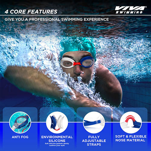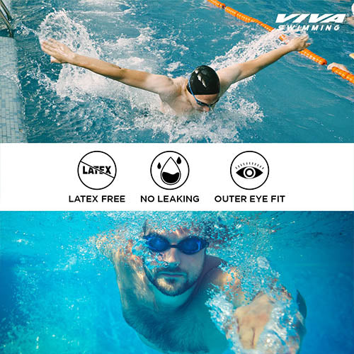 Swim with confidence using fog-free Viva Vision goggles for Professional Swimmers, designed with premium quality, anti-fog, and UV protection for clear, protected vision. Crafted from soft silicone, these goggles ensure a watertight, ergonomic comfort fit. Lightweight, durable, and equipped with adjustable straps, Viva swimming goggles are versatile for all water activities and available in stylish country colors inspired by Brazil, USA, Germany, and France. Put them on and adjust the swimming goggles to your face. Experience ultimate comfort with our ergonomically designed swimming goggles. No more pinching or discomfort during your swim. The soft silicone gaskets ensure a perfect, leak-proof seal, keeping water out and minimizing pressure around your eyes. Stay focused on your swim, confident that your goggles will stay securely in place throughout your entire session.