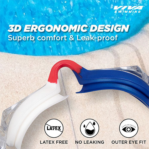 Viva Swimming USA Country Color 3D Ergonomic Design|UV Protection, Anti Fog, Leak-Proof Goggle with Adjustable Straps & Nose Clip|Professional Swimming Goggles for Kids, Men & Women with Protection Case Kit